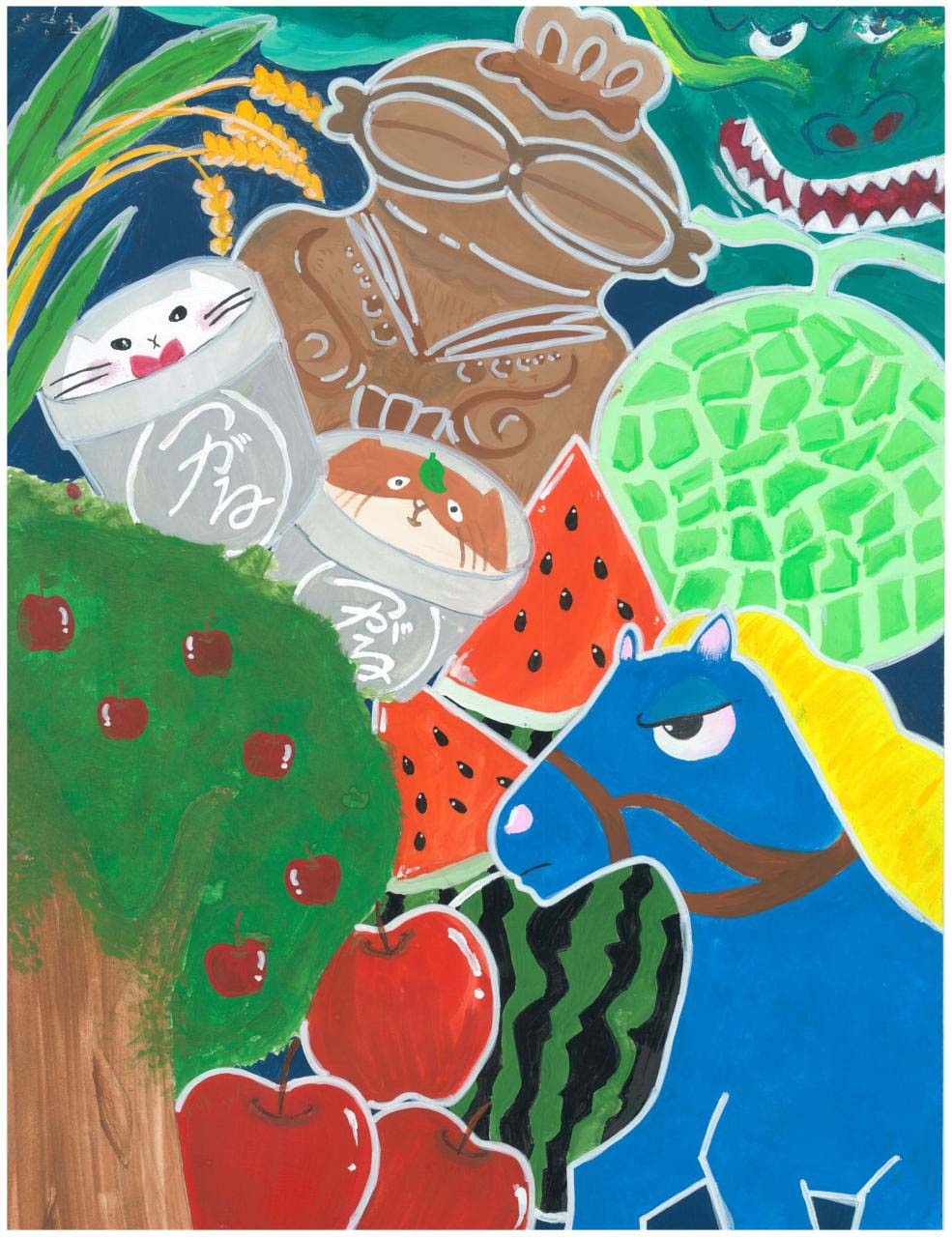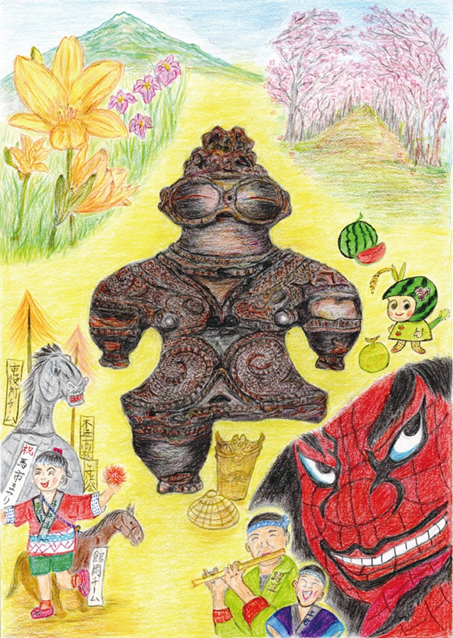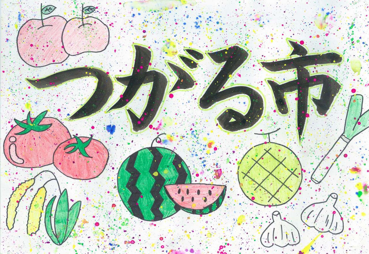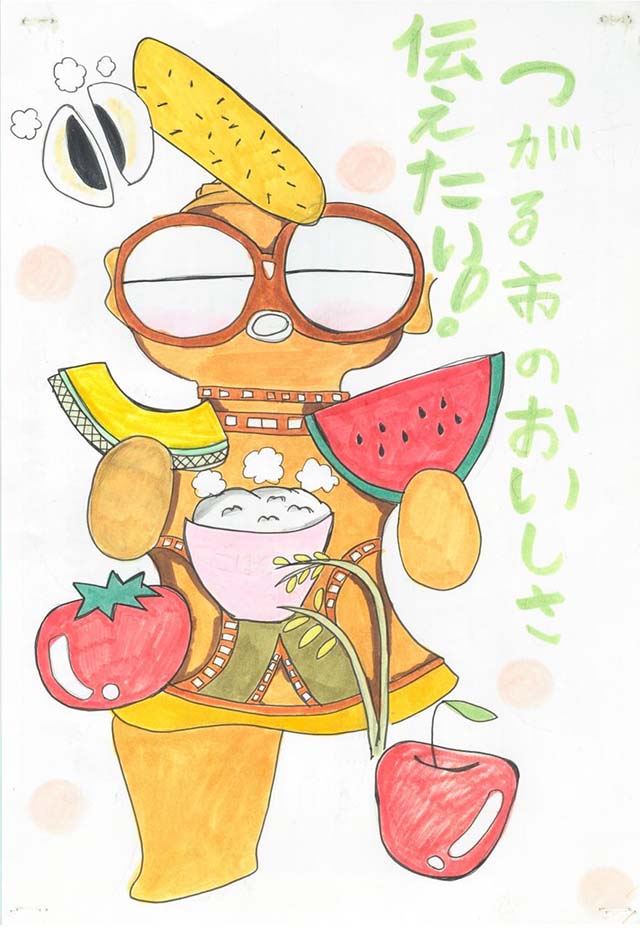 つがる市にある特産物を中心に描きました。私の知っているつがる市の食べ物や馬、土偶を大きく紙、全体に描くように心がけました。