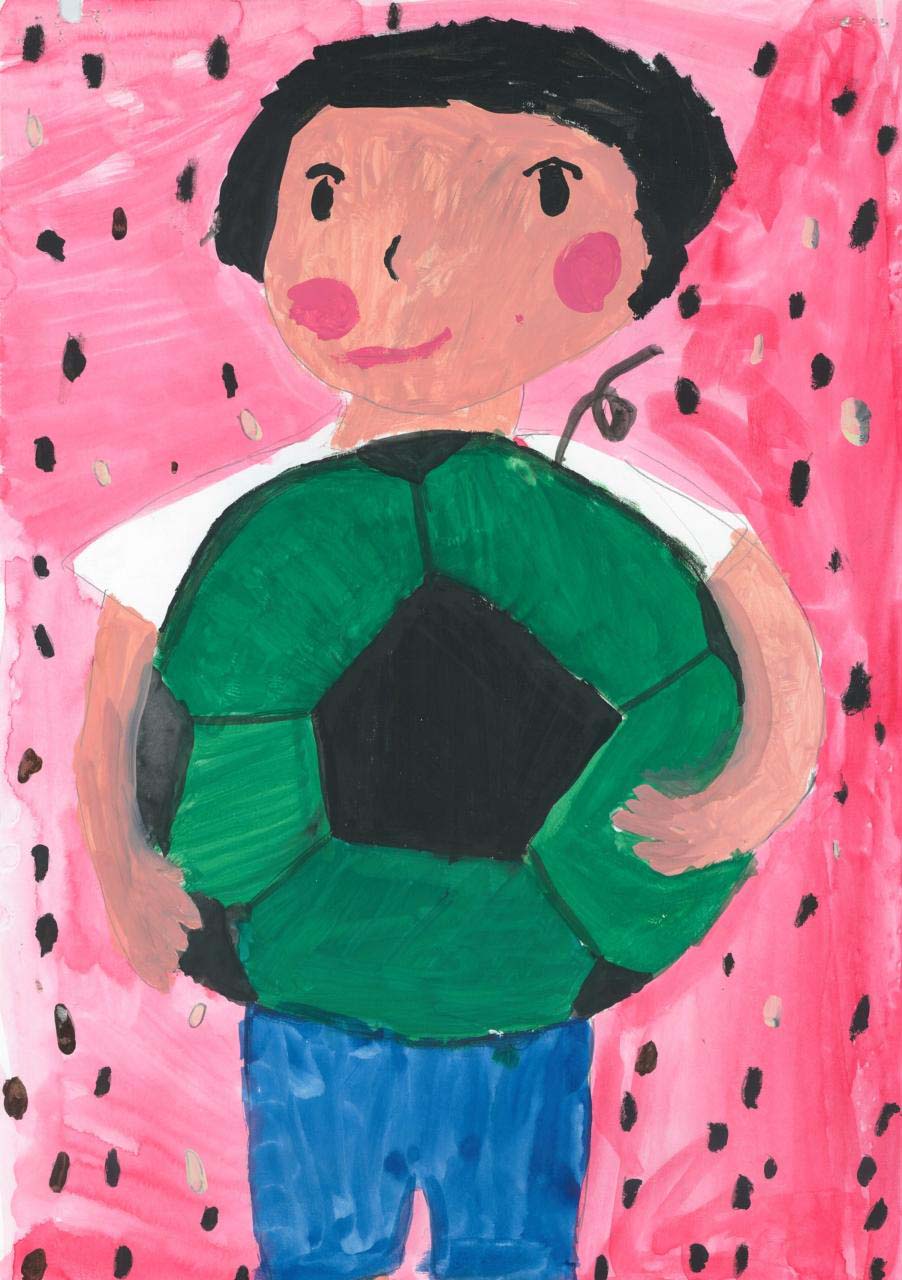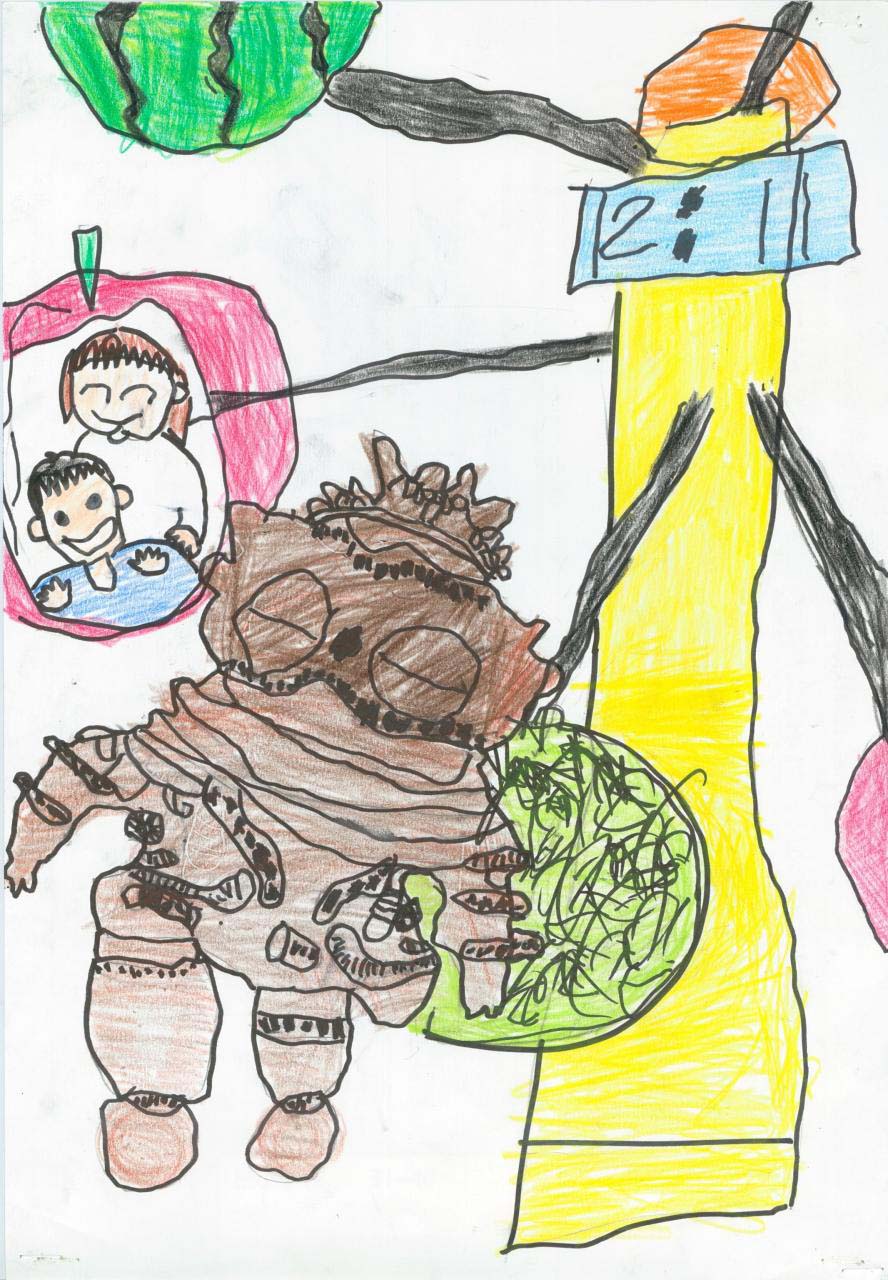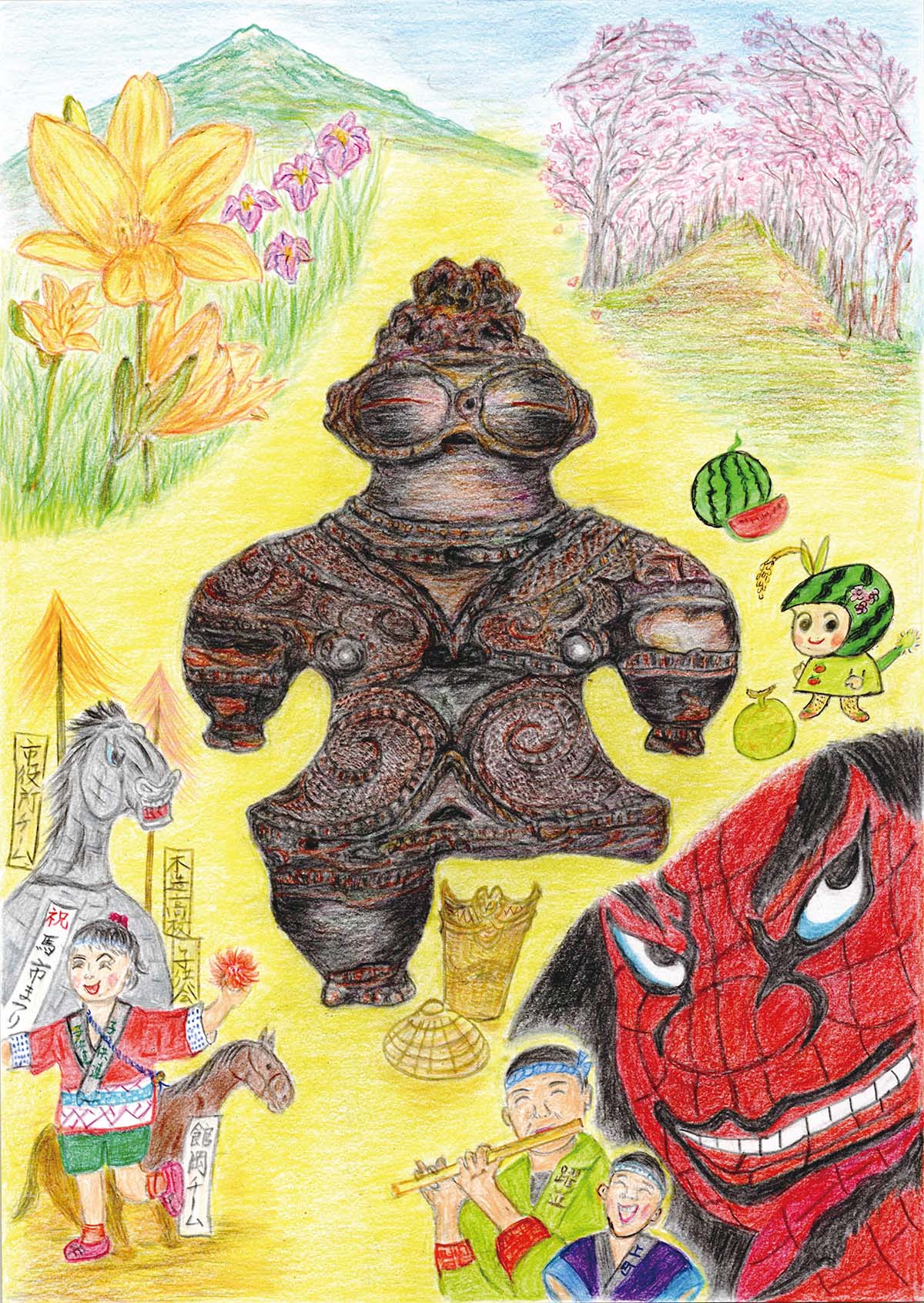 つがる市にある特産物を中心に描きました。私の知っているつがる市の食べ物や馬、土偶を大きく紙、全体に描くように心がけました。
