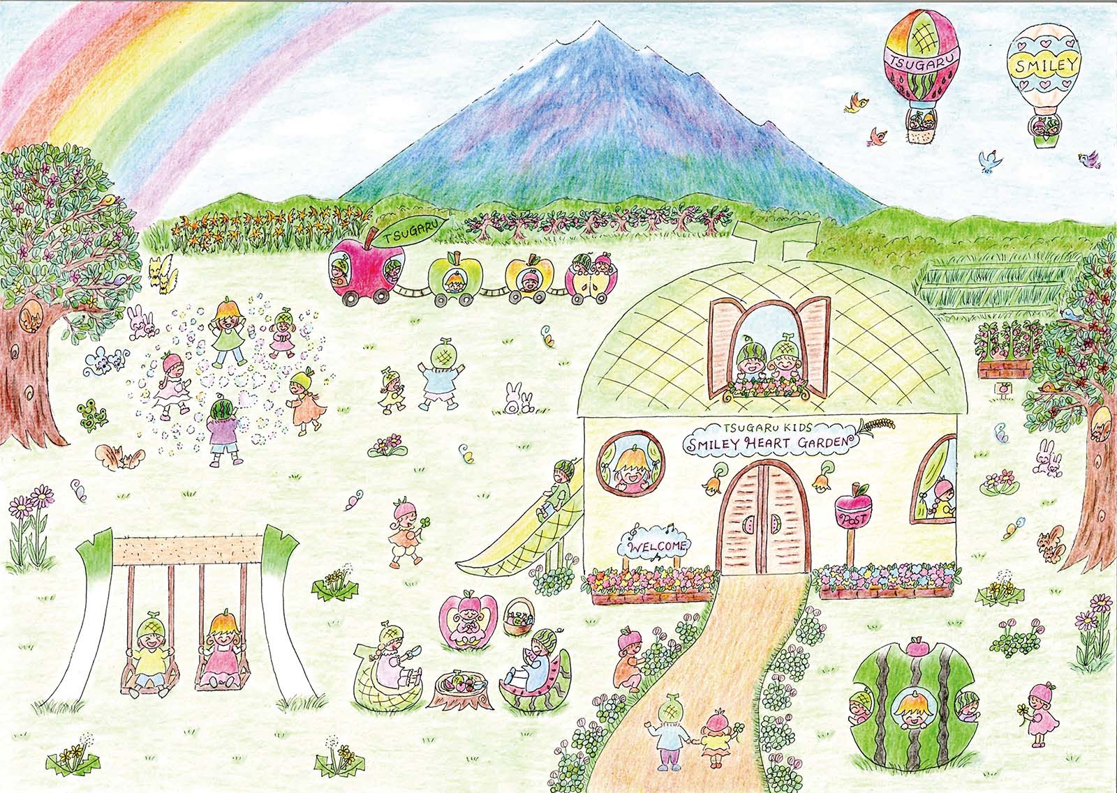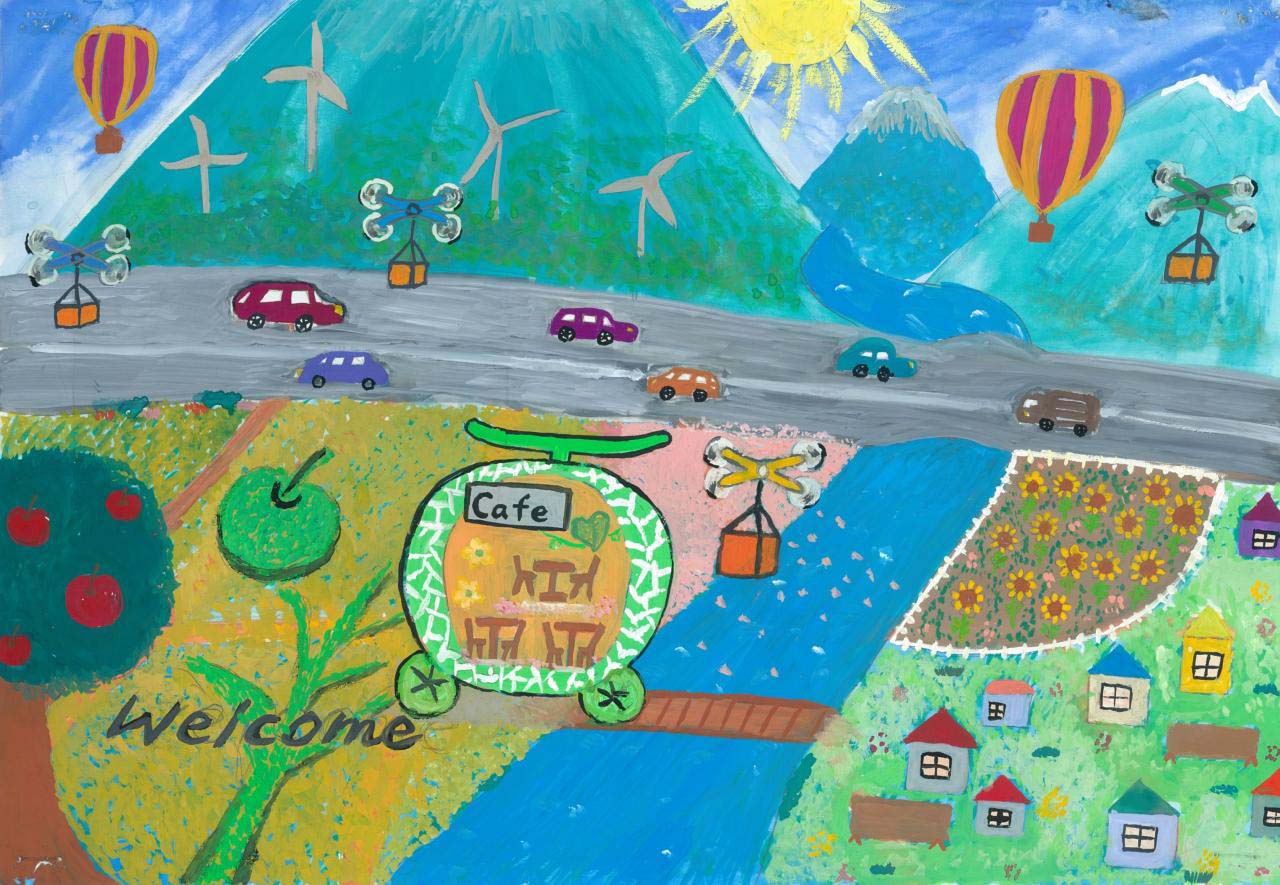 つがる市は自然が多く、この落ち着いた住みやすい環境が私は大好きなので、この環境のまま、さらに農業が発展し、住む人がたくさん増えるよう、つがる市の特産物のメロンをカフェにし、ドローンタクシーで、つがる市の自然をたくさんの人に見てもらえたら良いなと思い描きました。